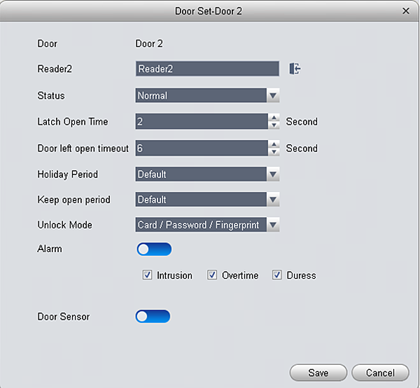 - Reader (card reader): support naming of reader, and setup of entry/exit status. The following is default setup.