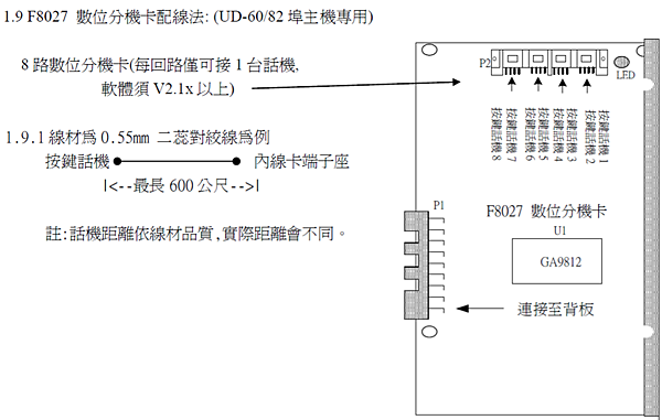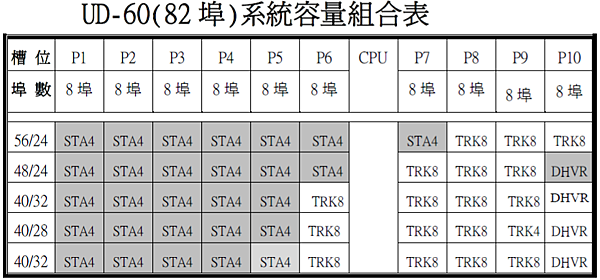 2.UD-60(82埠) 系統共有10個槽位,P1~P10可以插數位內線卡 (F8007)或單機卡(F8008)