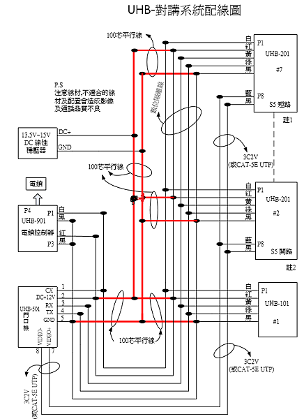 ![]() 註 1: 配線的終端 UHB-201 ,在 S5 位置須短路.